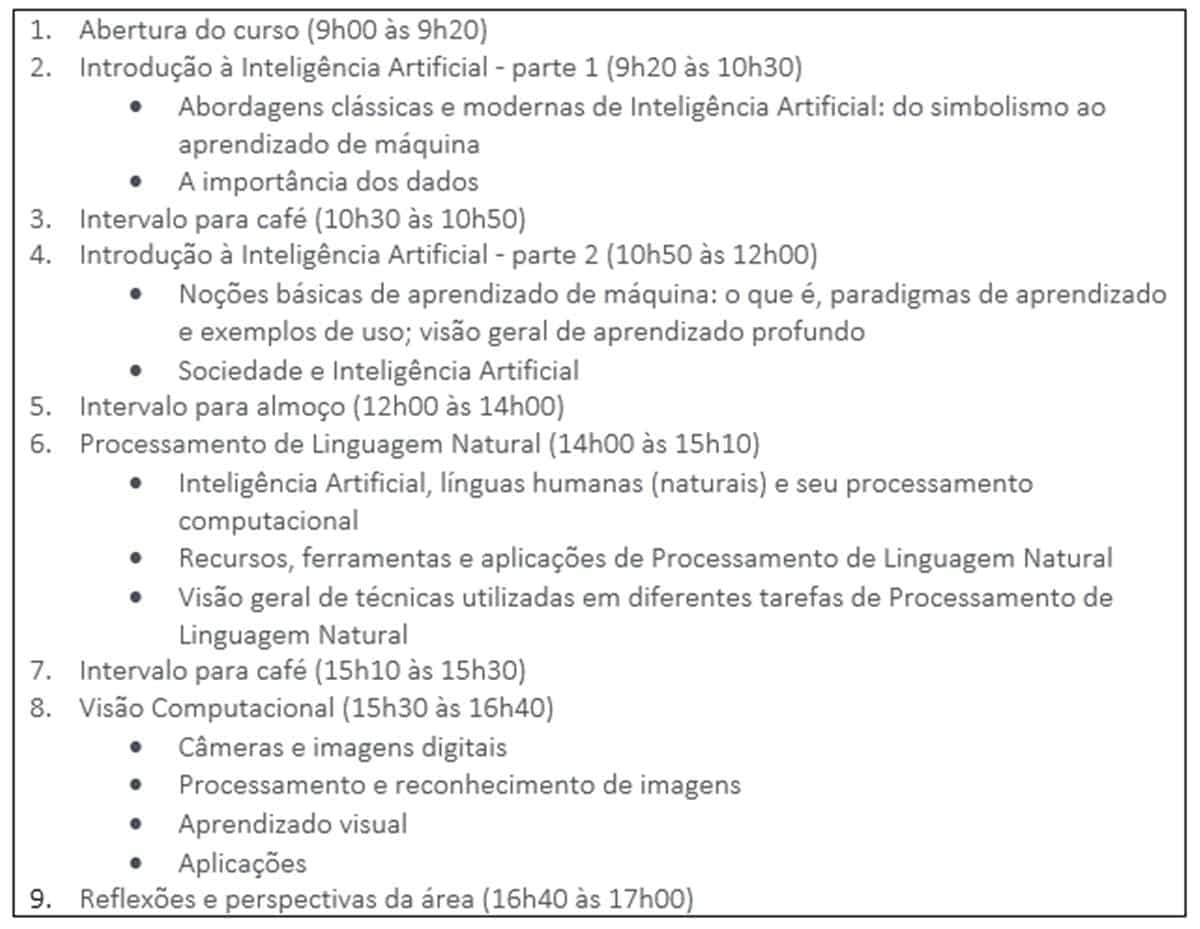 Fora as aulas, os inscritos poderão participar, ainda, de bate-papos virtuais sobre inteligência artificial, que ocorrerão na semana seguinte, entre 8 e 12 de abril, sempre das 14h às 15h, via Google Meet.