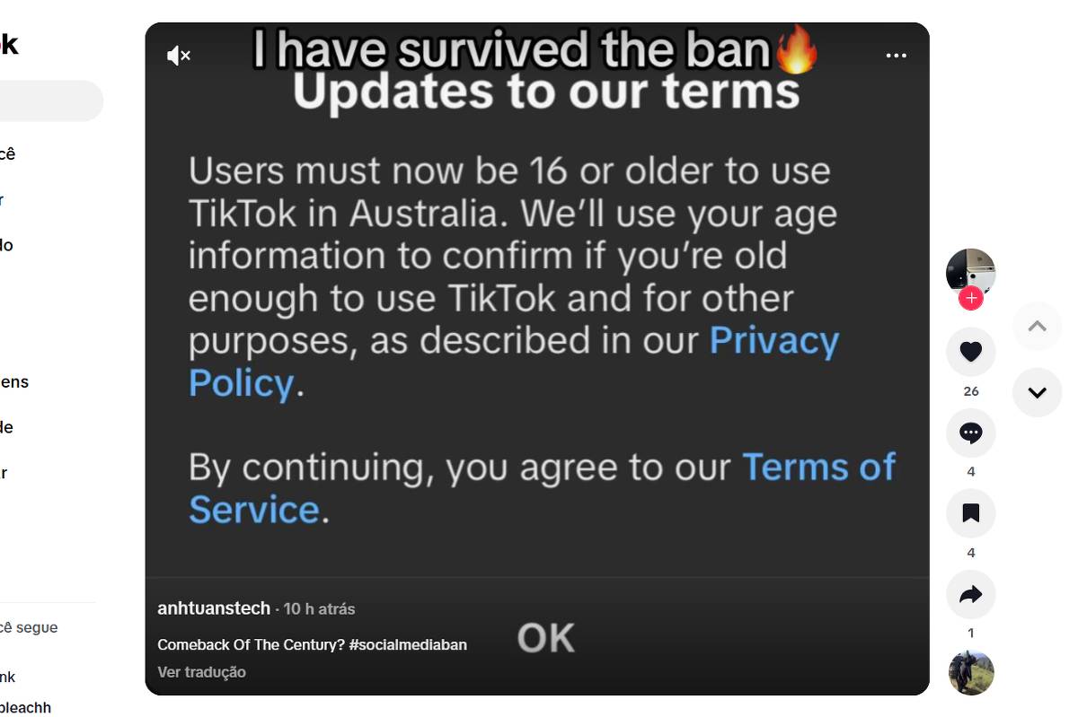 Adolescentes australianos menores de 16 anos publicaram vídeos na terça-feira (9) se despedindo de seus seguidores, à espera do início do bloqueio de redes sociais. Mas nesta quarta-feira (10), no primeiro dia da medida, alguns comemoraram nas próprias plataformas o fato de ainda conseguirem acessá-las normalmente.