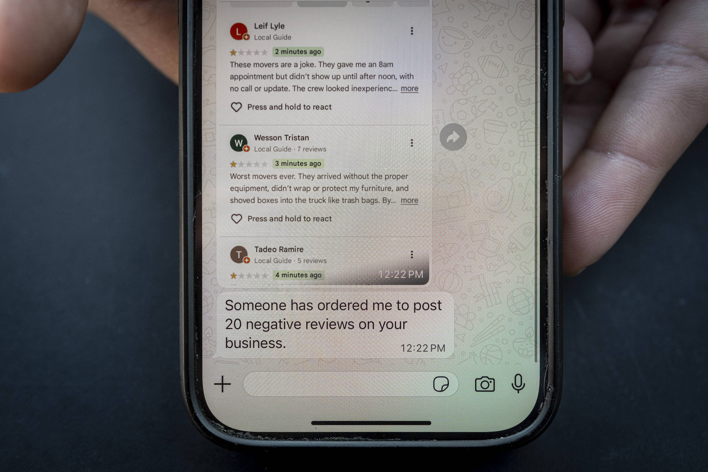 “Alguém me contratou para postar uma avaliação negativa sobre o seu negócio”, dizia a mensagem de um número do Paquistão. “Recebi a ordem de postar 20 avaliações.”