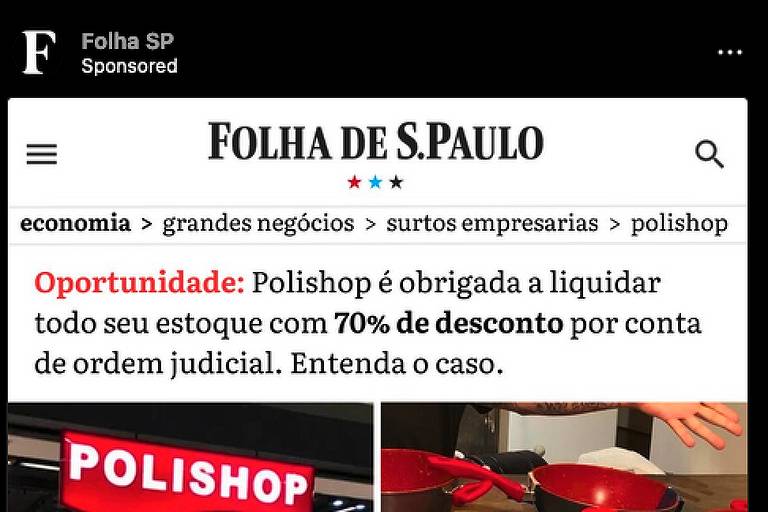 Os criminosos acrescentam à história real uma suposta liquidação online com descontos de até 76%. Ao pé do texto, há um botão que levaria a falsa liquidação —outro site fraudulento de nome “liquidashop”, mistura de liquidação e Polishop, outra empresa vítima do golpe.