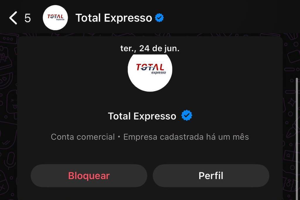 Kathyllen Gomes Paulino, 30, supervisora financeira, também recebeu mensagens com o selo de verificado da “Total Expresso”. “Por ser uma empresa de grande porte, acreditamos que o processo de verificação seja rigoroso, mas ainda assim procuro analisar o conteúdo antes de clicar em qualquer link”, conta.