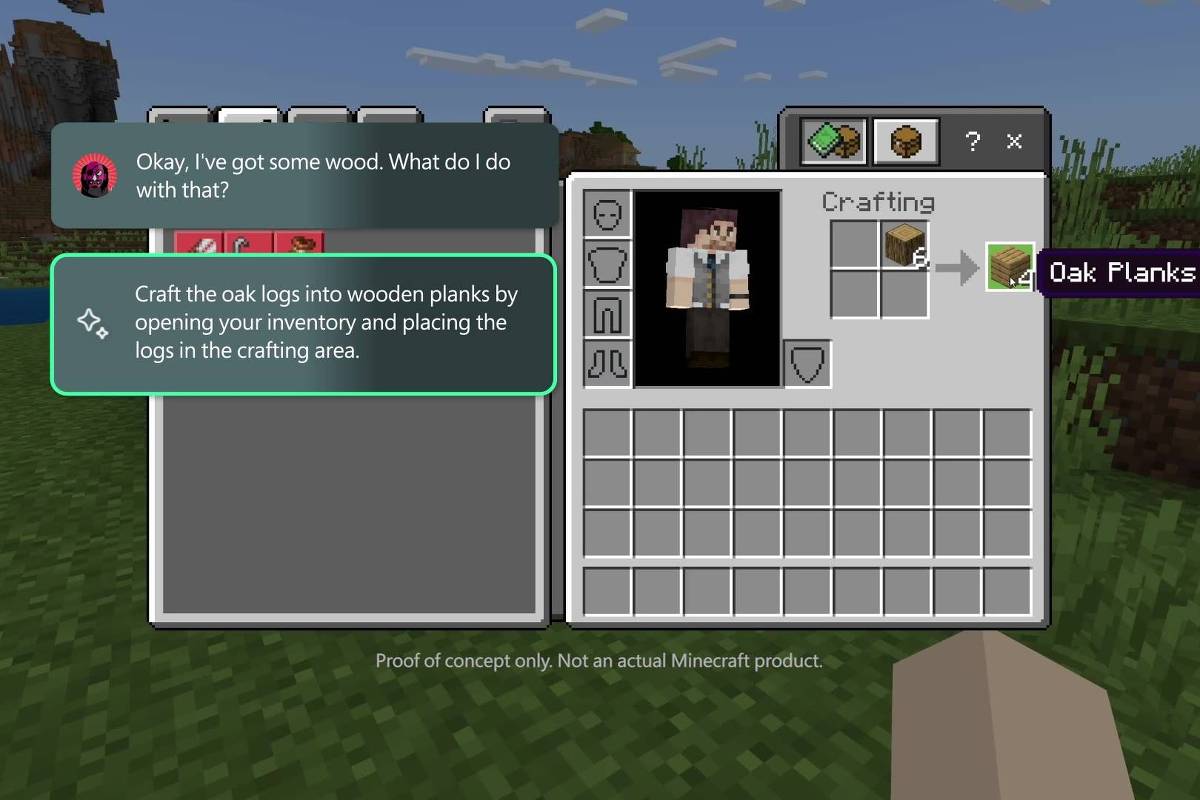 Em um dos exemplos apresentados, um jogador de “Minecraft” pergunta à IA sobre o que é possível construir a partir da madeira que coletou. A tecnologia, então, responde ensinando como criar tábuas.