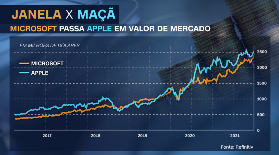 O embate entre Microsoft e Apple pela posição de empresa mais valiosa do mundo é uma existe ao longo dos anos.